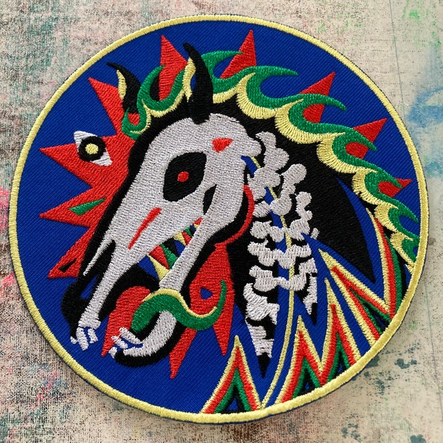 刺繍×フェルト地ワッペン(再入荷)。 背面は圧着仕様となっておりますので、アイロンなどでつけられますが縫い付けをお勧め致します。 アーティストZONZAI氏の手掛けるDIYブランド 【NO MAD NUMSKULL】 デザイン、シルクスクリーンの製版、 プリント、ウエストポーチなどのアイテムの縫製まで自ら行う。 【サイズ】 80mm×80mm