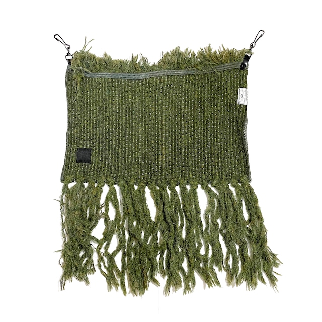 手編みニット(KHAKI×GRAYの毛糸)で 手間をかけ作製された フリンジ付きのGARA流バムフラップ。 腰回りに限らず冬場はショールやネックウォーマーの如くアレンジもよいかと。 【素材】 COTTON50%WOOL50% 【サイズ】 one SIZE (H45cm×W40cm)