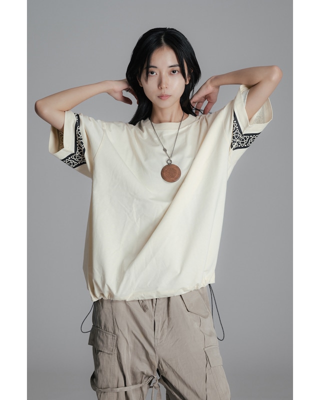 袖にケルトデザインをプリントした ドローコード付きのTシャツ。 ビックシルエットながらドローコードによって どんなボトムでも合わせやすい仕様になってます。 【素材】コットン100%(6.5oz) 【サイズ】 M肩幅56cm身幅62cm着丈70cm袖丈21cm L肩幅59cm身幅65cm着丈73cm袖丈22cm X.L肩幅62cm身幅68cm着丈76cm袖丈23cm