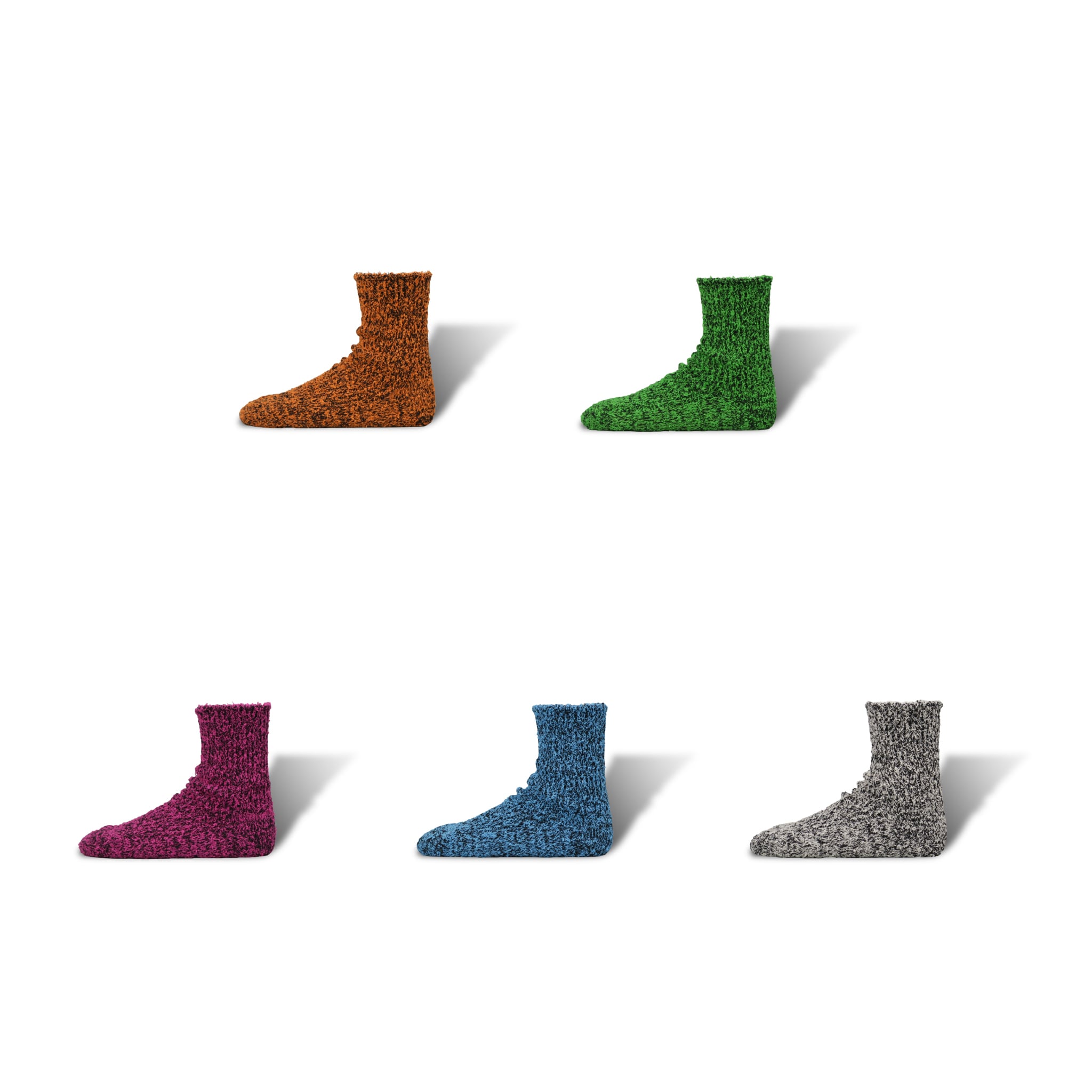 あまり靴下で用いられることのない、強い特徴を持つ個性的な2種類の糸を引き揃えて編むことで、独特な印象のデザインに仕上げた。