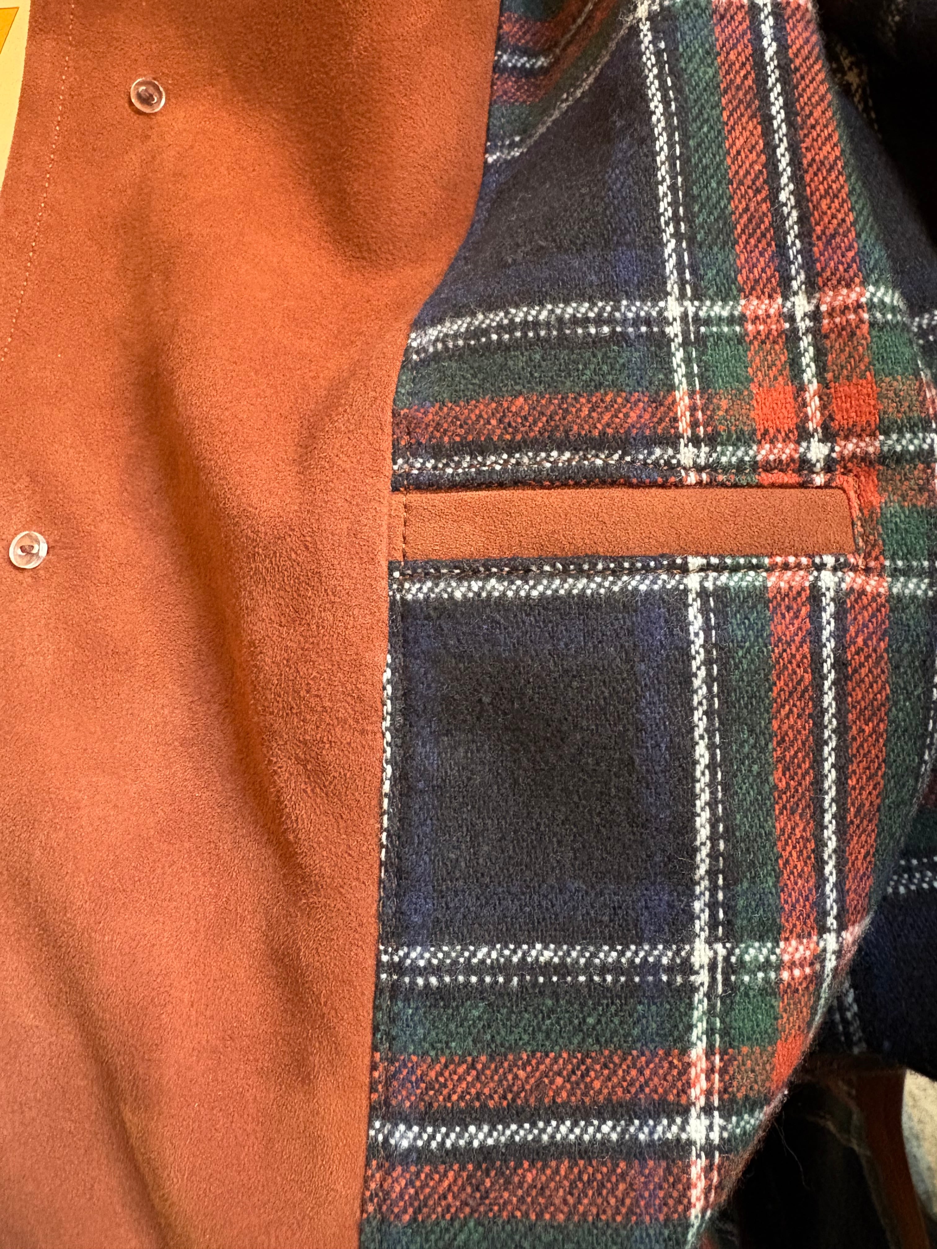 同革のくるみボタンやヴィンテージライクな裏地のタータンチェックなど、さり気ない演出。