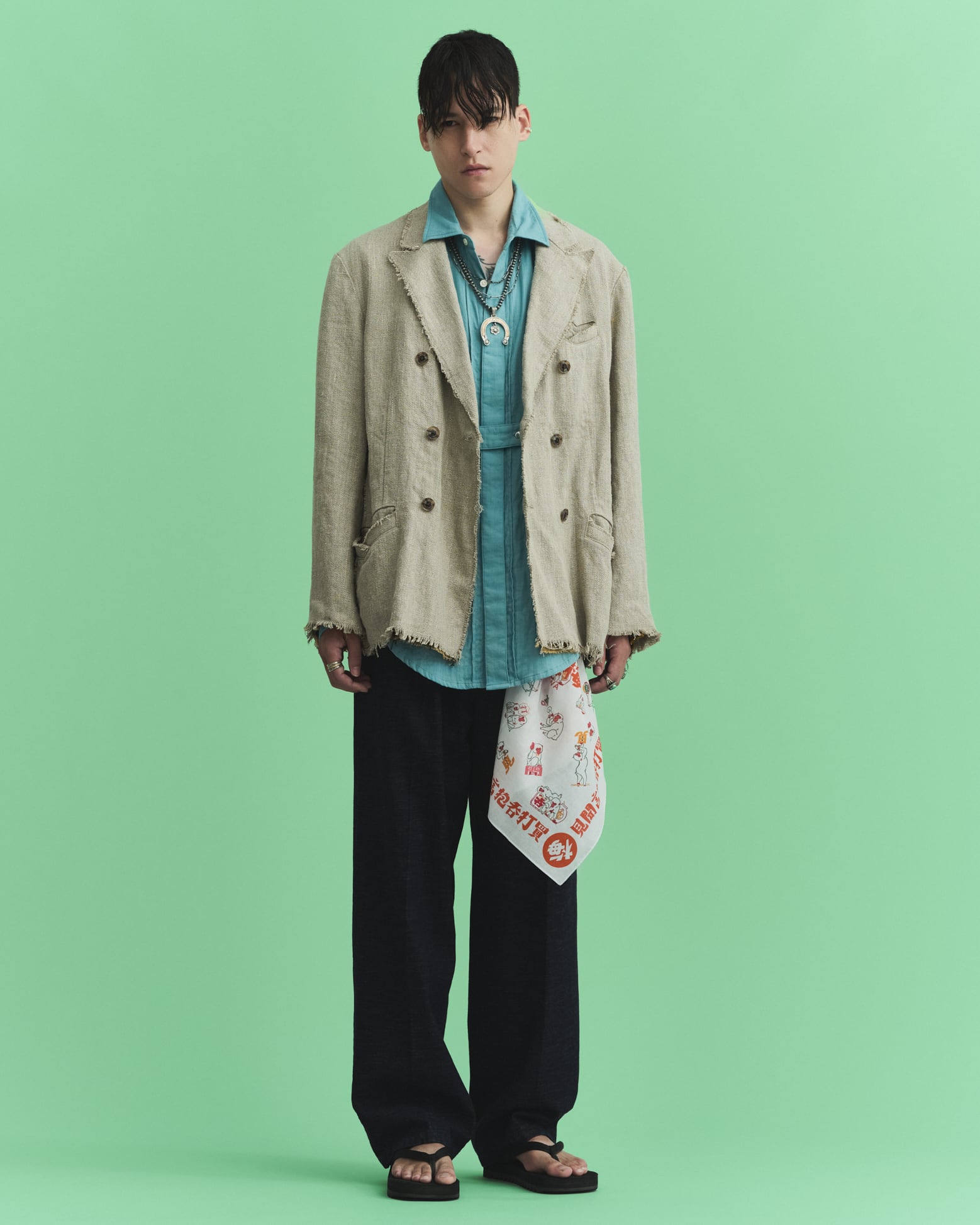 腹部のストラップにインディアンジュエリーをイメージした、雰囲気のある形状のシルバー925製釦を贅沢に使用。