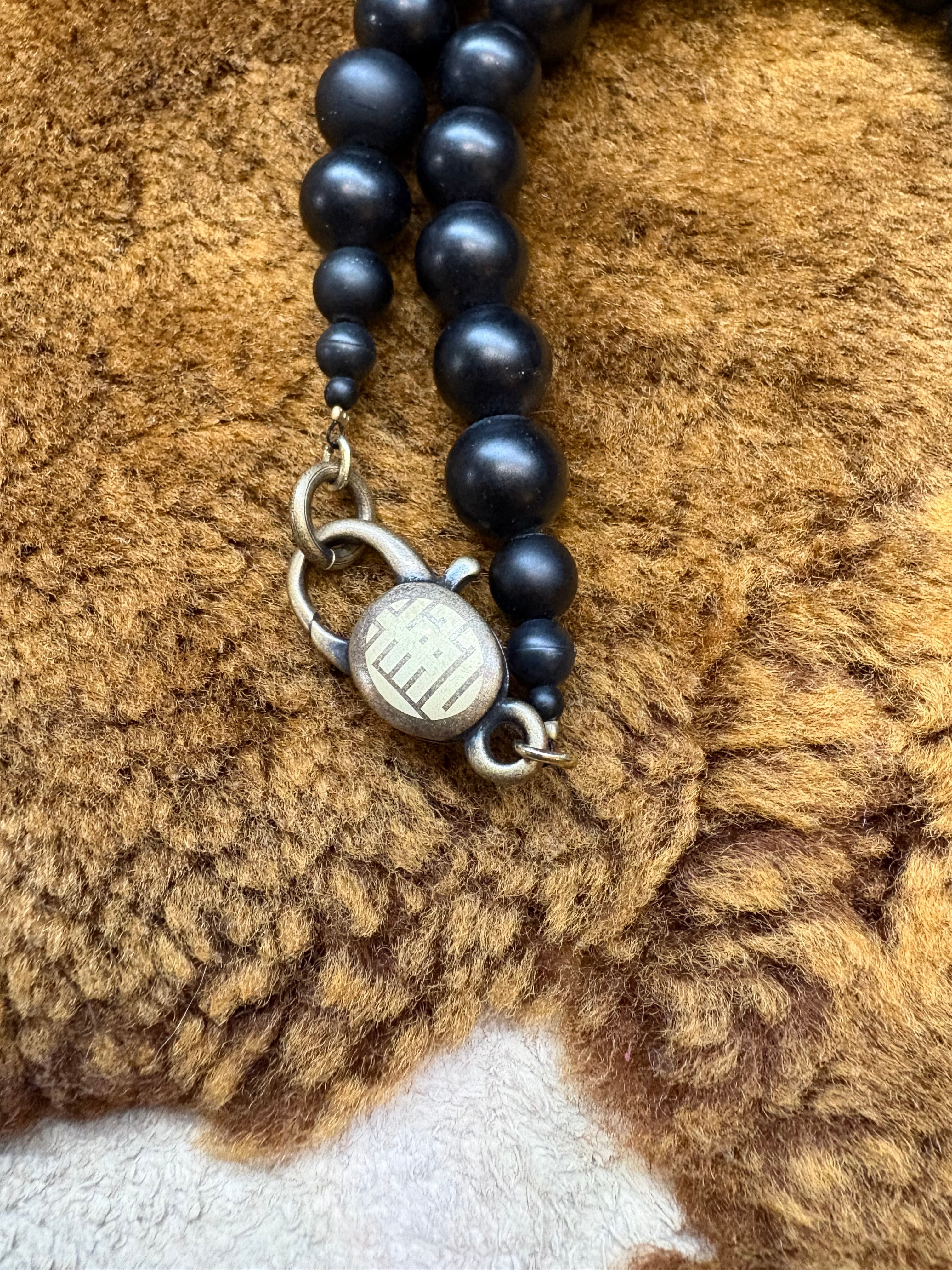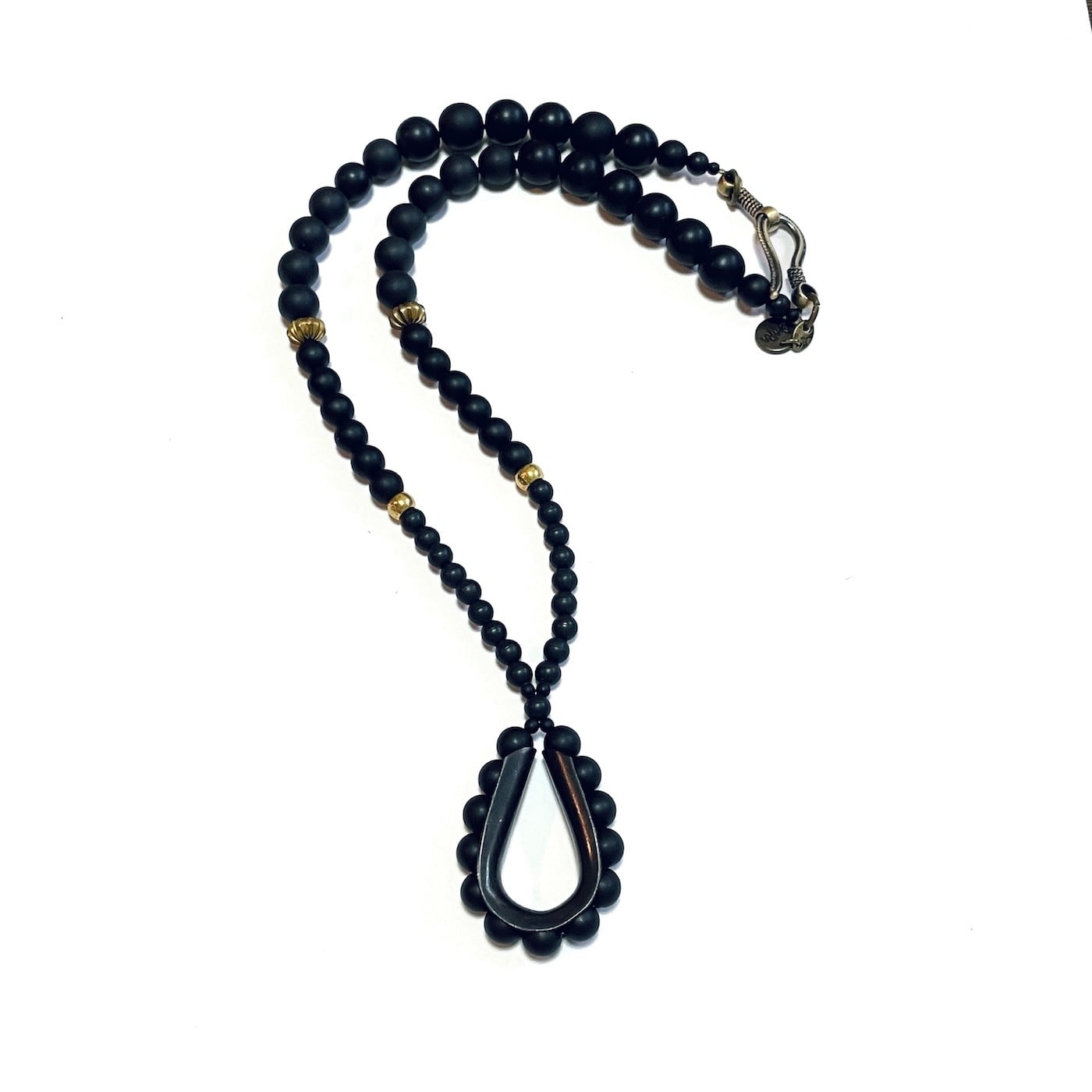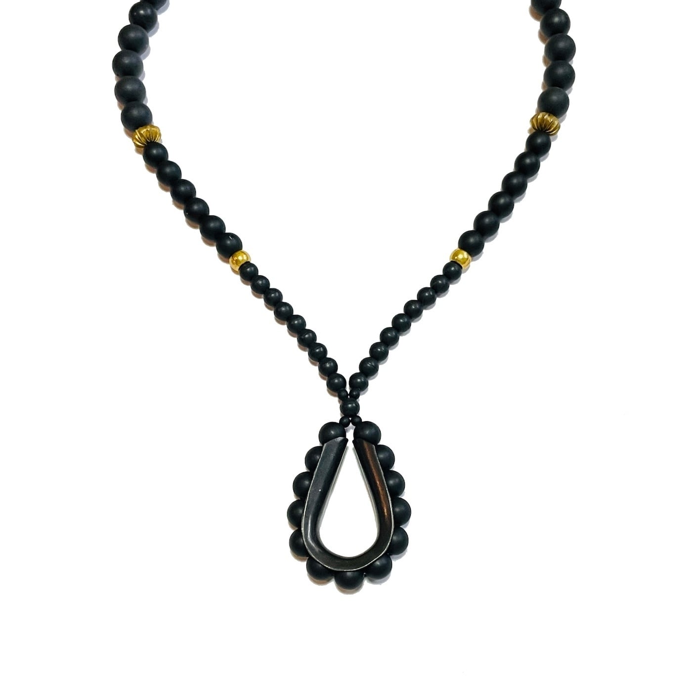 大小のマットブラックでインフィニティのようなデザインのネックレス。