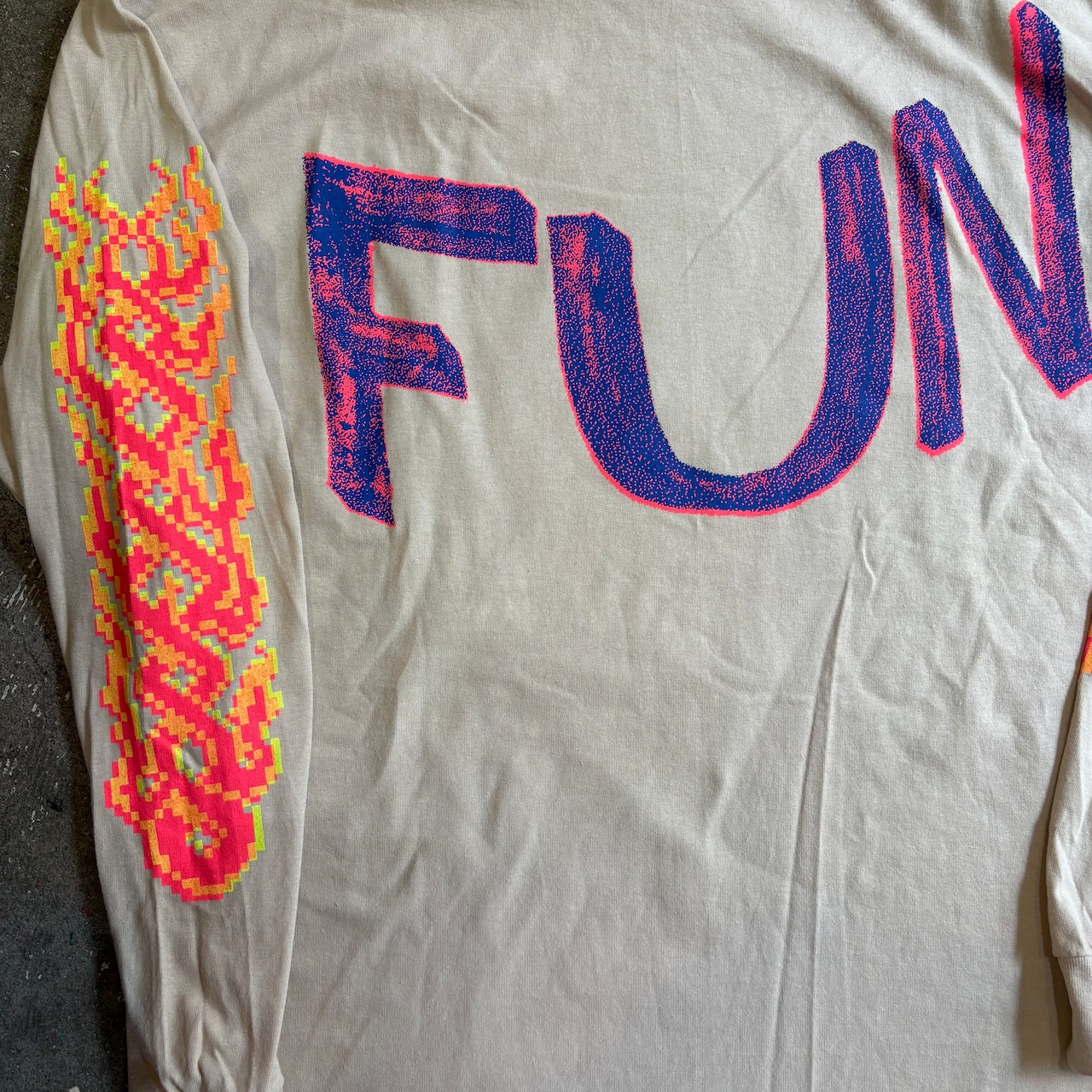 シルクスクリーンプリントはセルフプリント為、ズレや掠れムラ、色飛びなどがございますが、それも全て作り手の意図や、デザインのアジとしてご理解頂ければと思います。