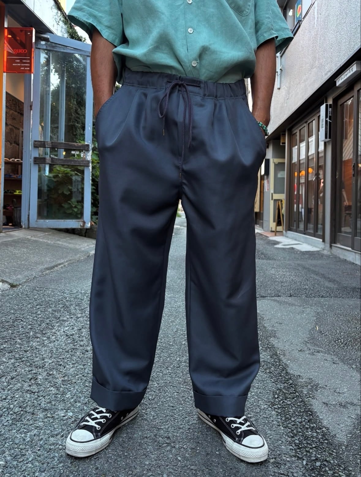 フリーサイズ設定(ユニセックス)ゆったりシルエットの2タックパンツになります。