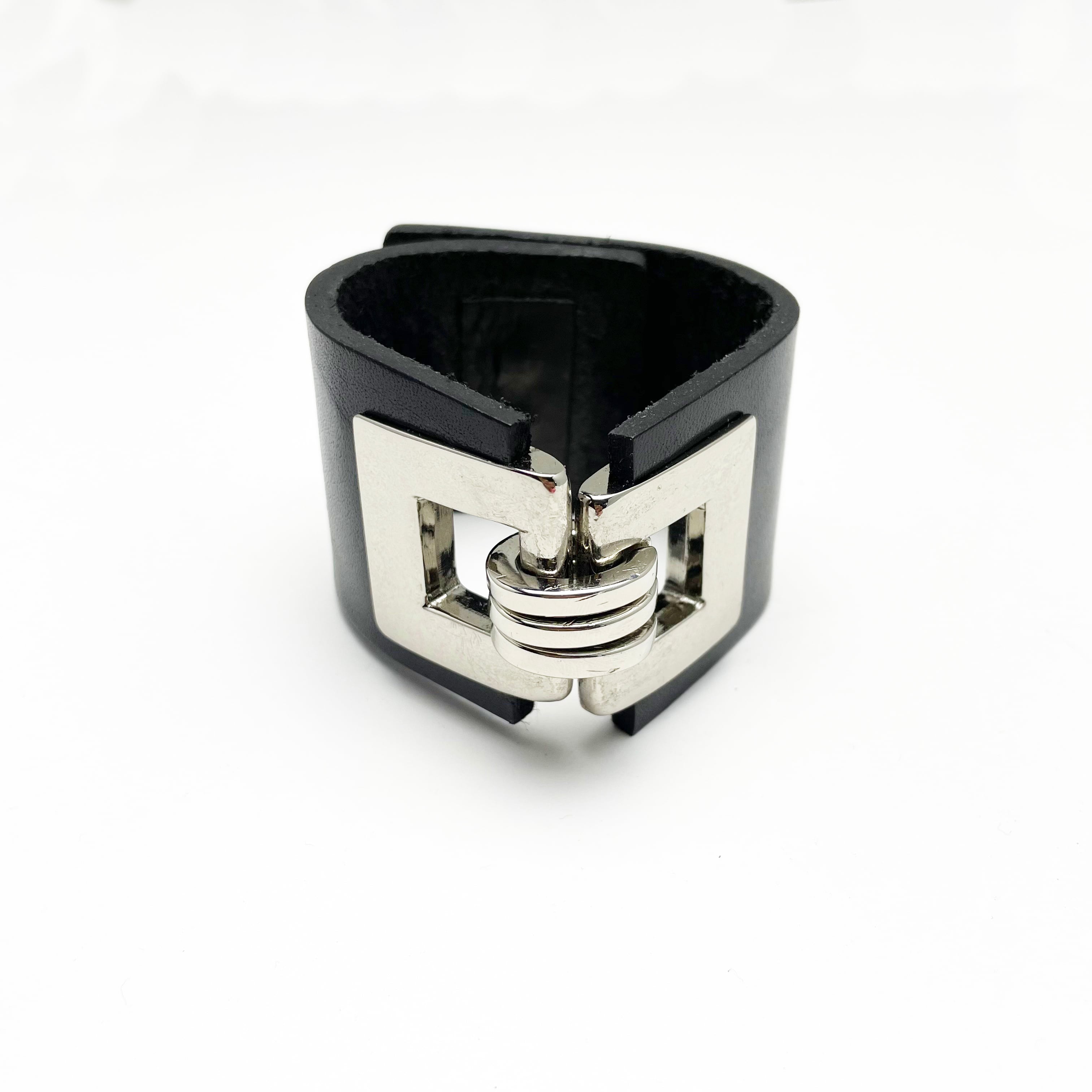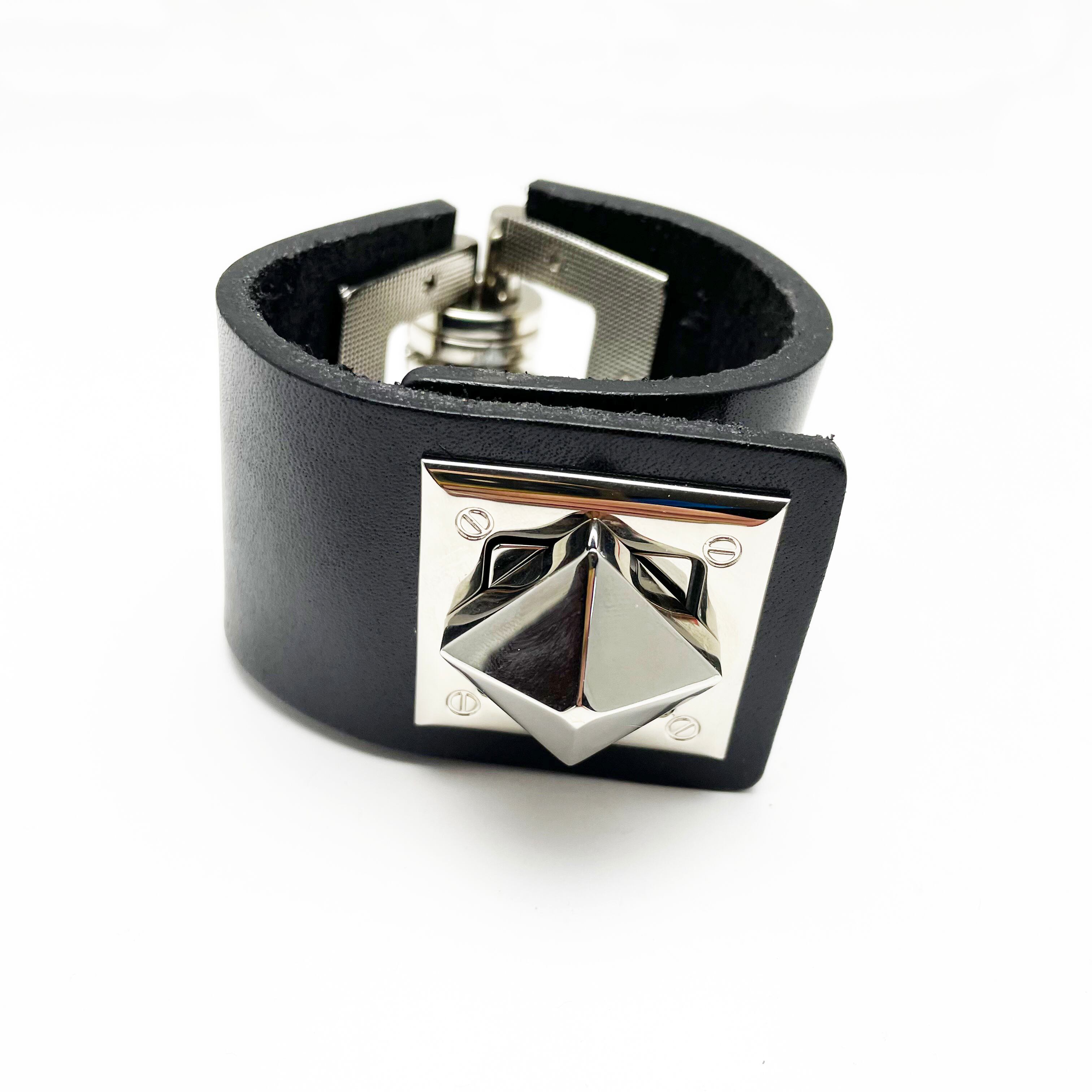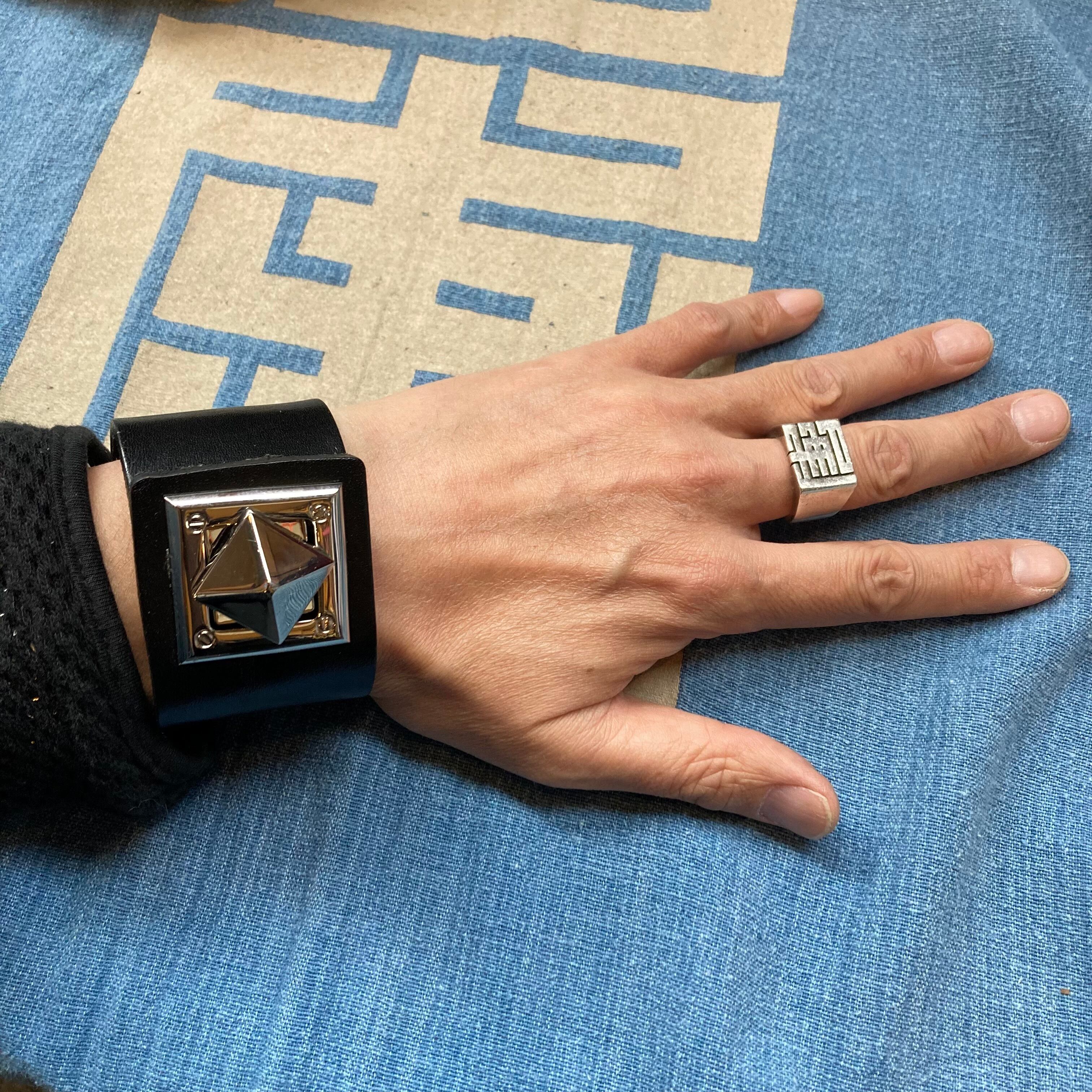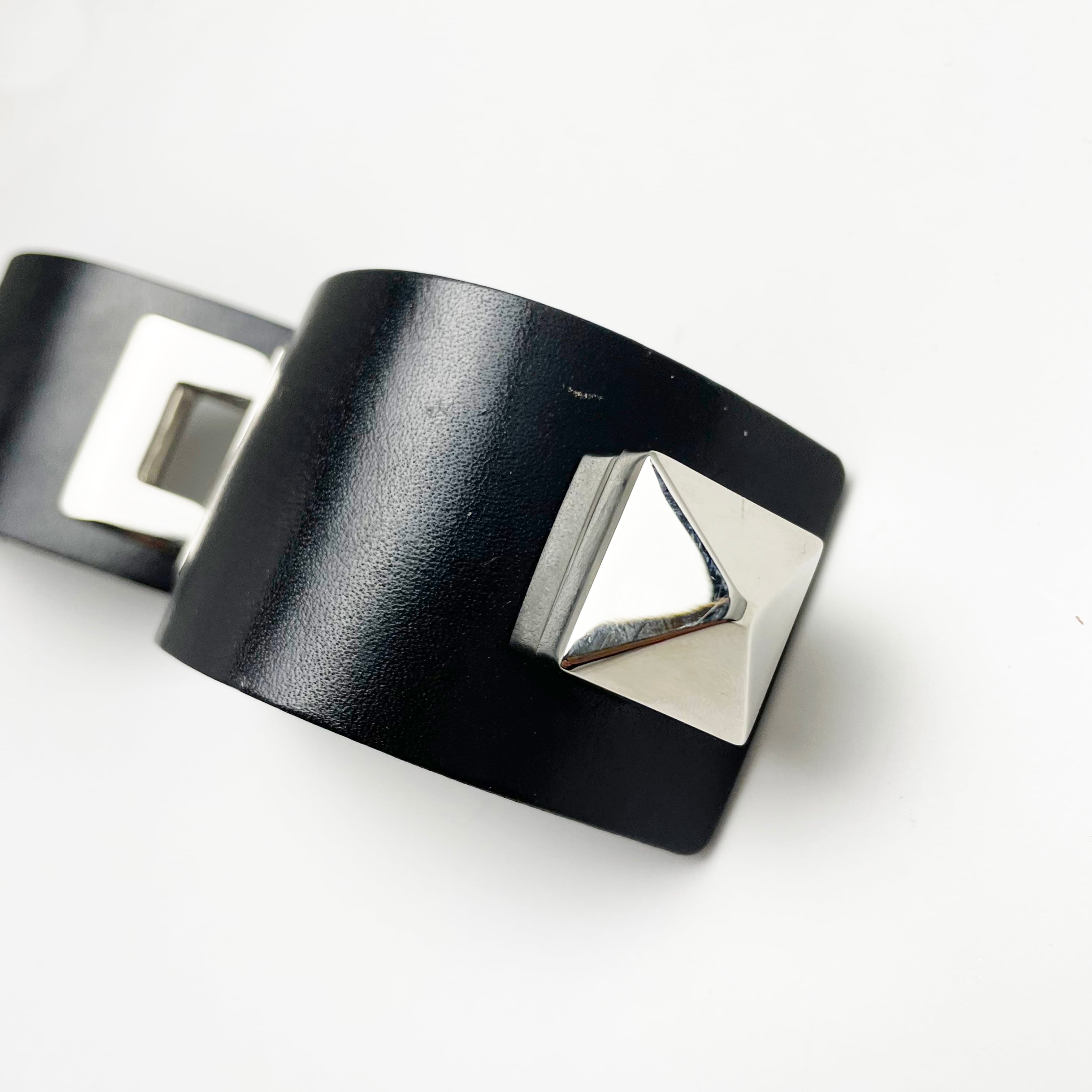 厚みのあるレザーを使用した存在感あるリストバンド。留め具はスタッズ型でエレガントな仕上がりです。
